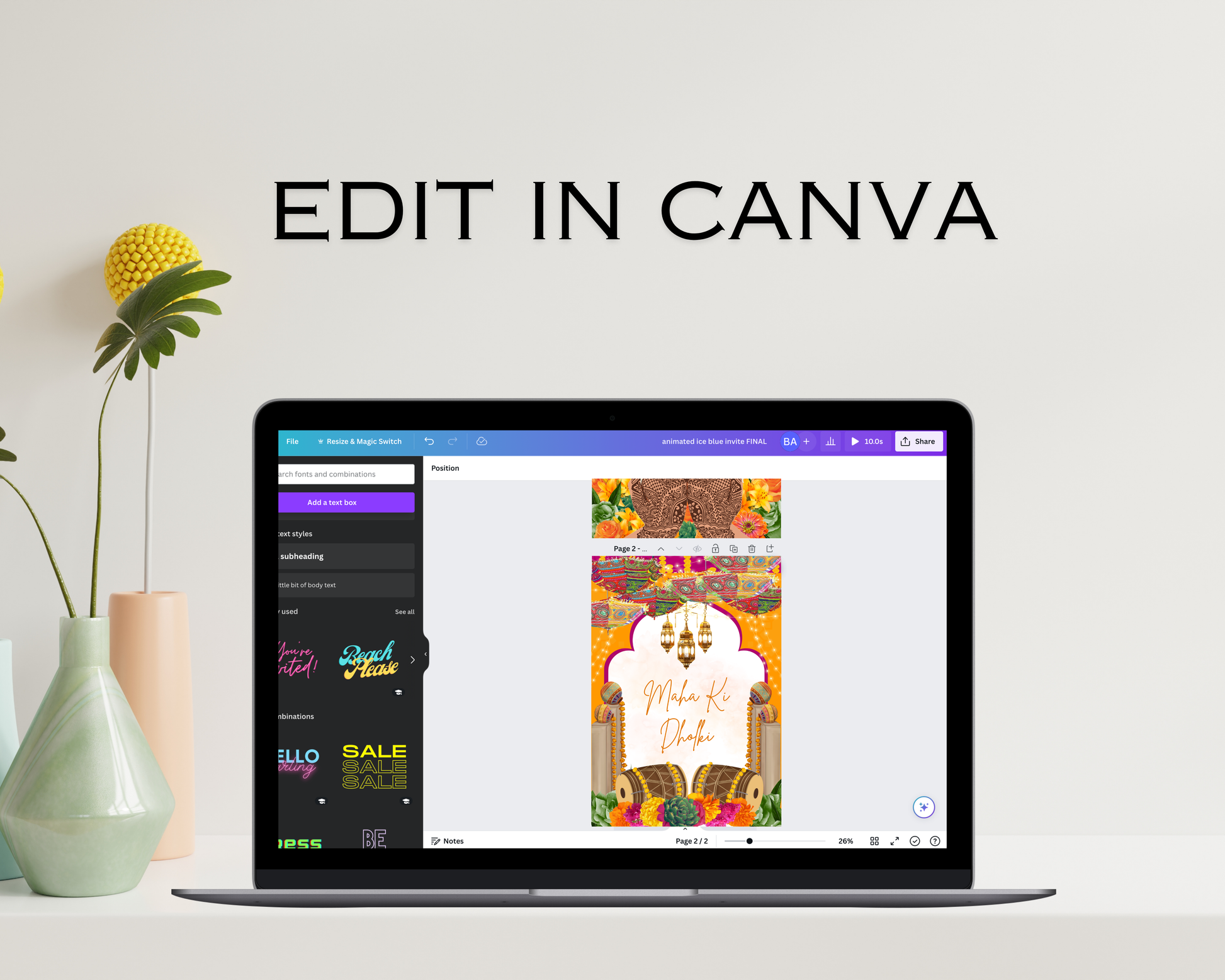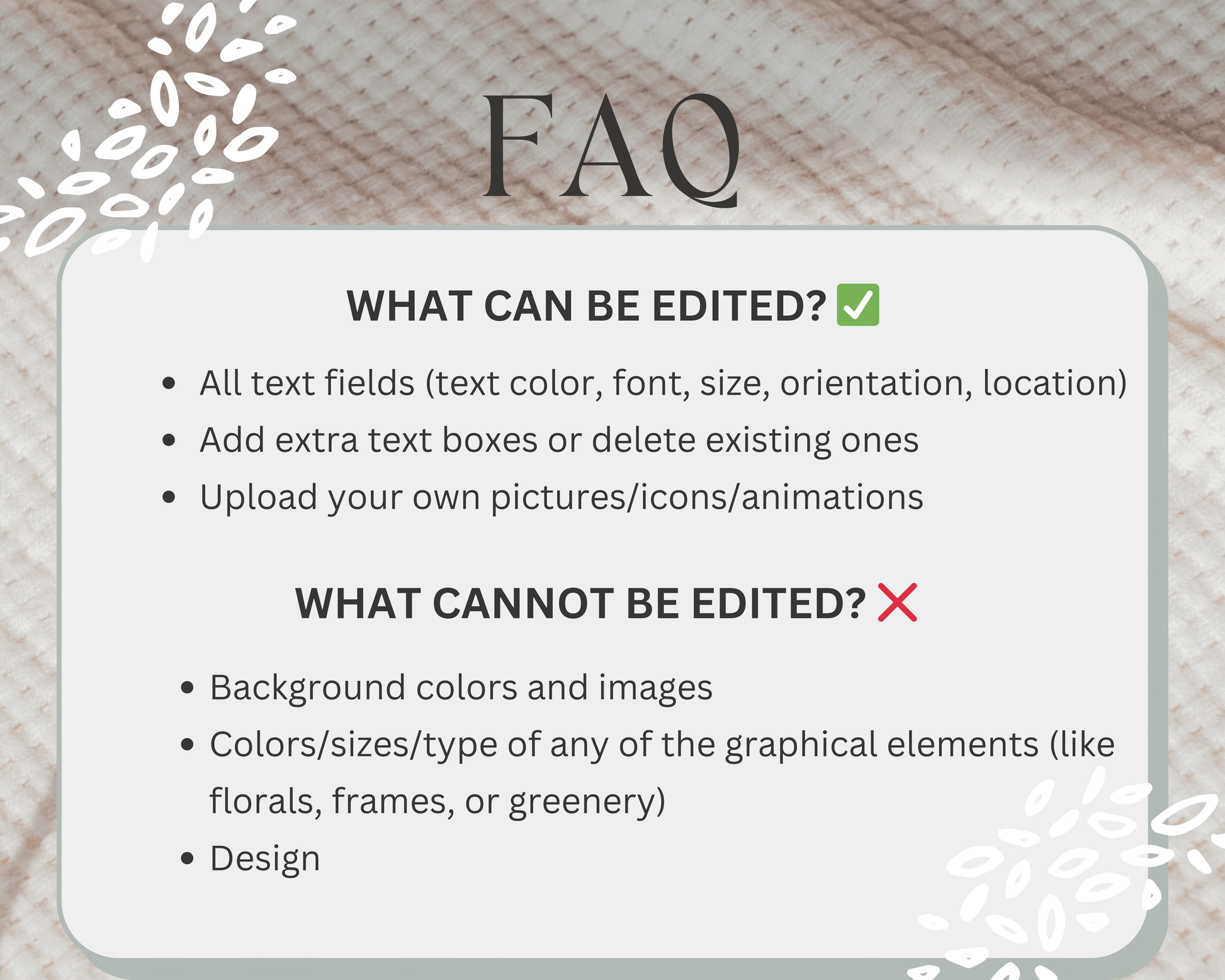 ❌ You cannot edit the background colors or colors/sizes/type of any of the graphical elements (like florals, frames, or greenery)