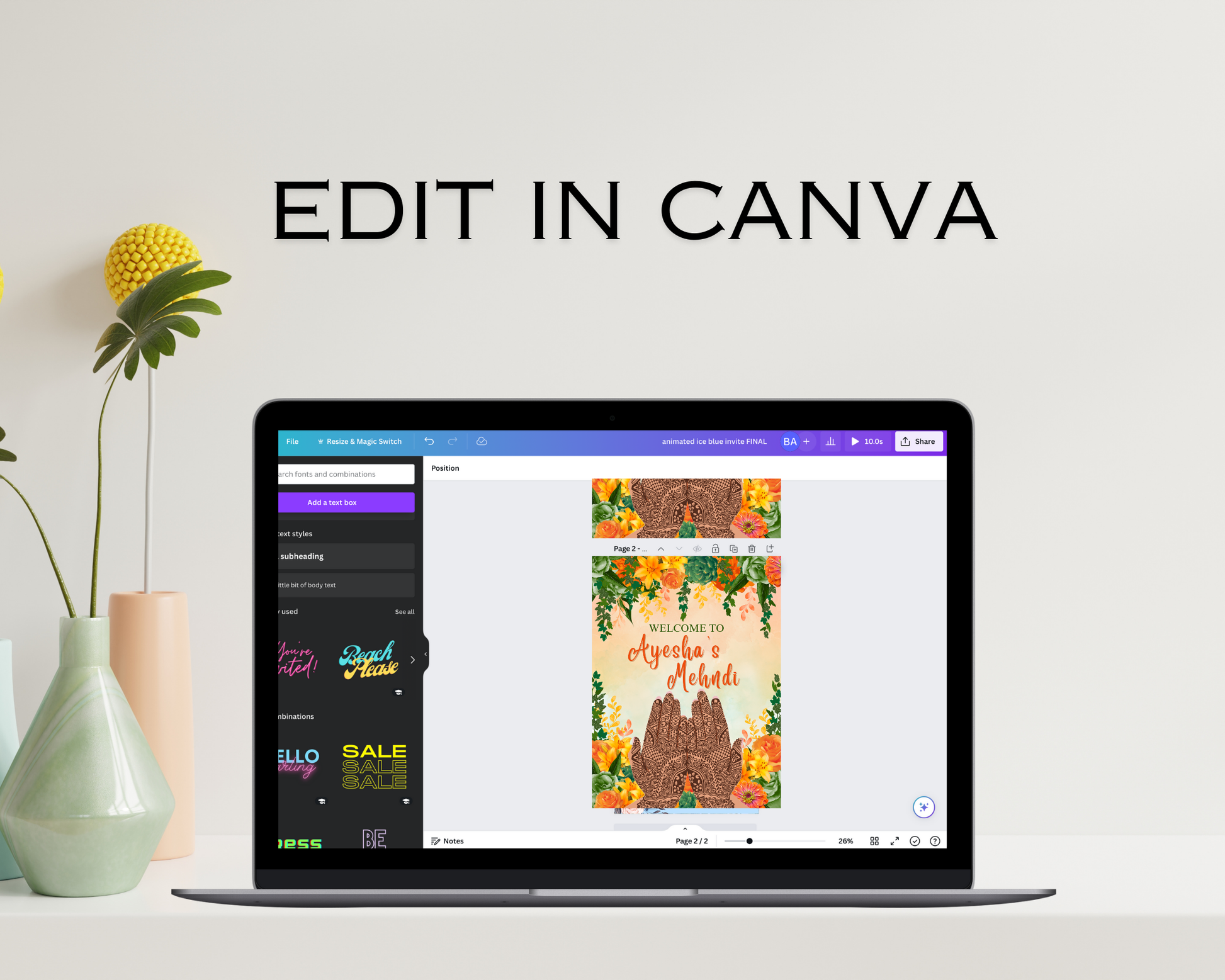 ❌ You cannot edit the background colors or colors/sizes/type of any of the graphical elements (like florals, frames, or greenery)