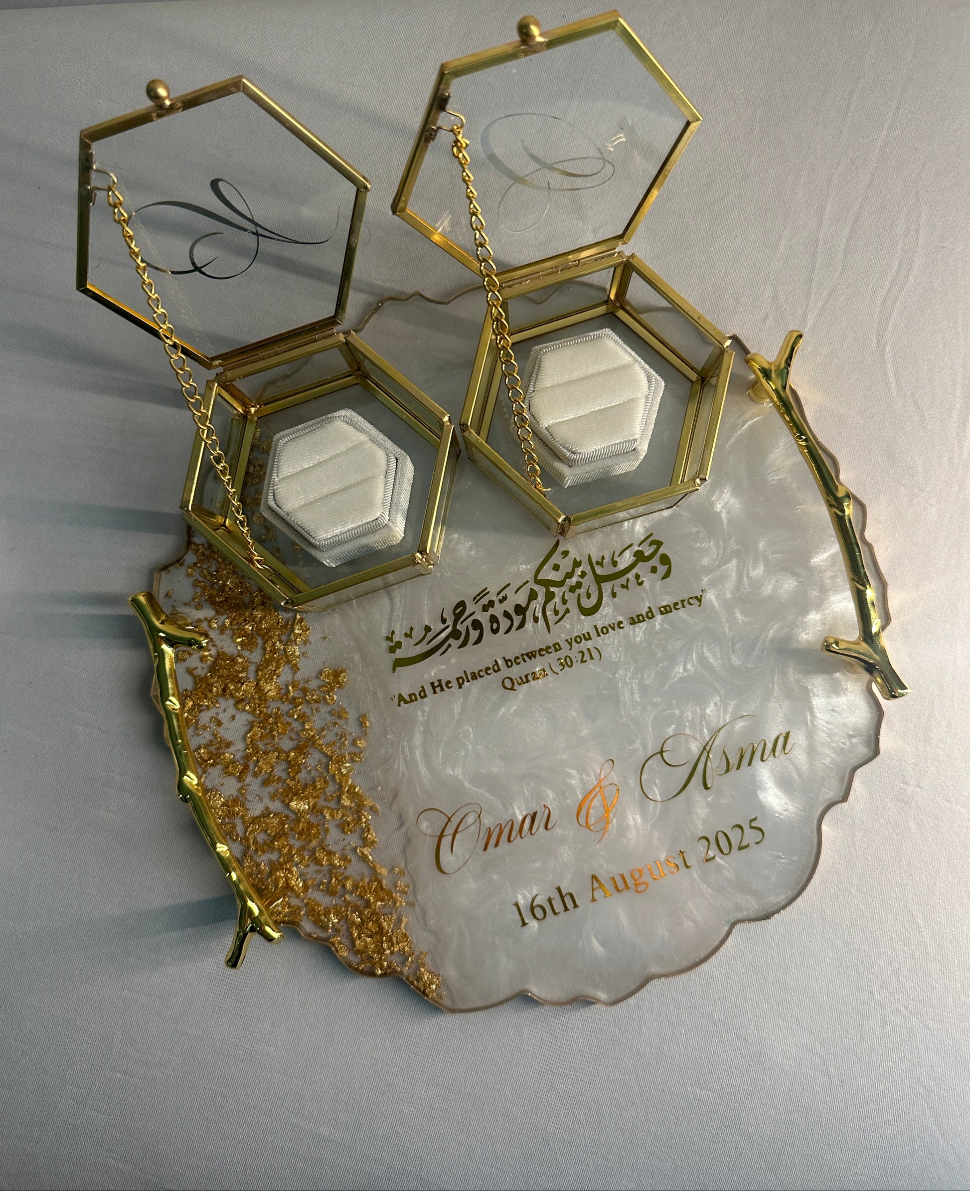 Enhance the elegance of your Nikkah ceremony with our beautifully crafted Customized Resin Ring Plate. This exquisite piece is thoughtfully designed to hold your precious rings, symbolizing the union of two souls. Expertly personalized with your names and date, it serves as a timeless keepsake from your special day.