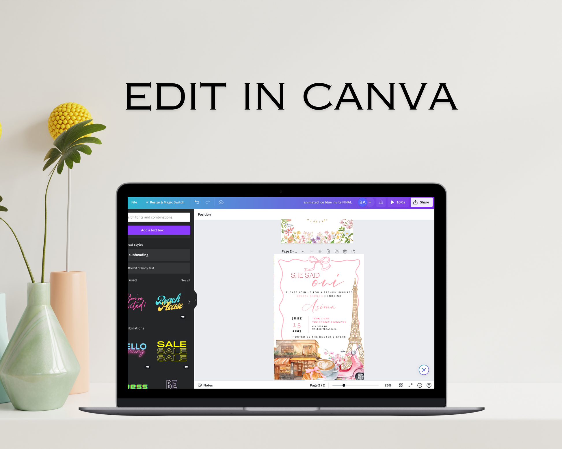 ❌ You cannot edit the background colors or colors/sizes/type of any of the graphical elements (like florals, frames, or greenery)