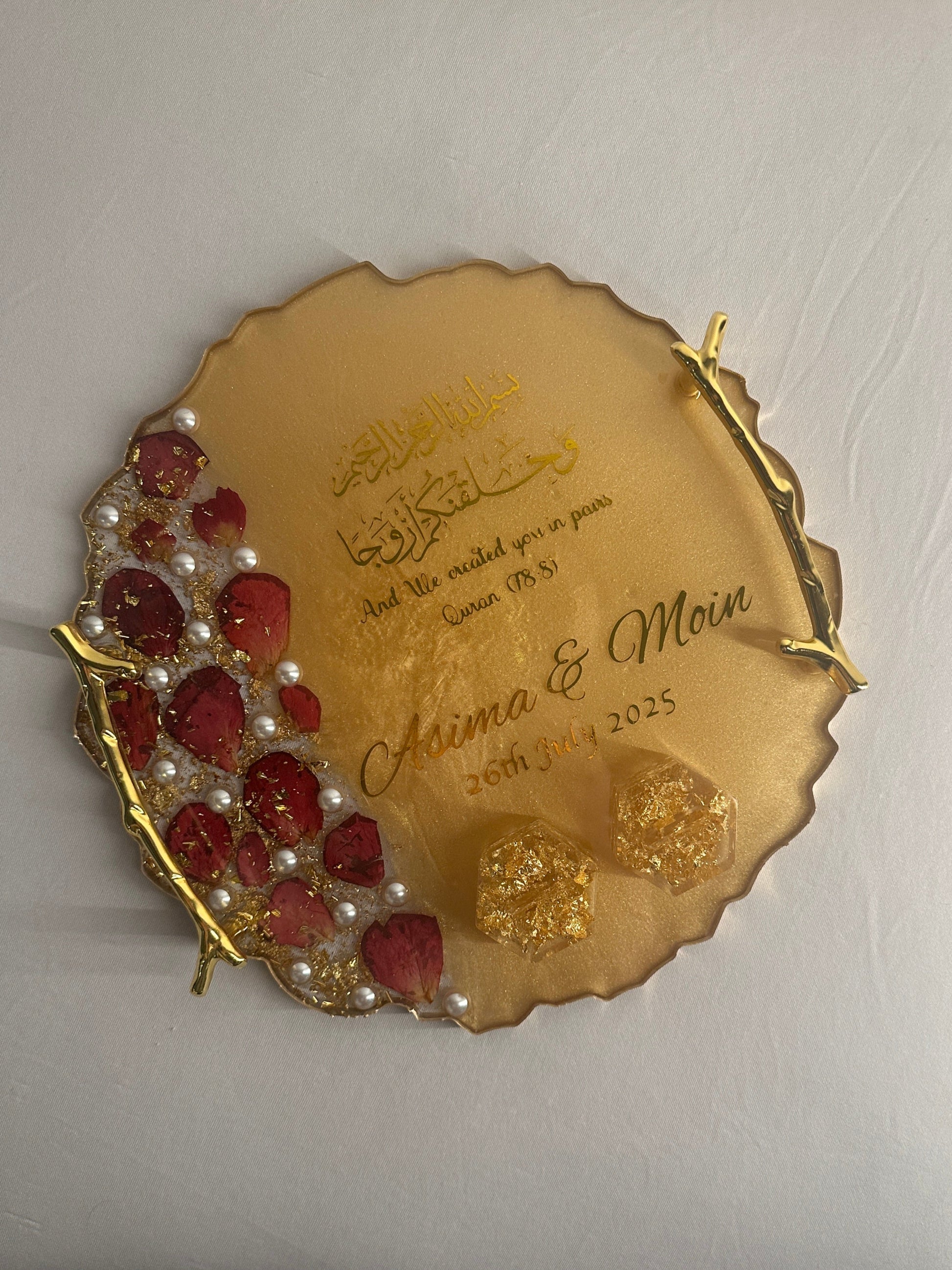 Enhance the elegance of your Nikkah ceremony with our beautifully crafted Customized Resin Ring Plate. This exquisite piece is thoughtfully designed to hold your precious rings, symbolizing the union of two souls. Expertly personalized with your names and date, it serves as a timeless keepsake from your special day.